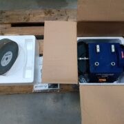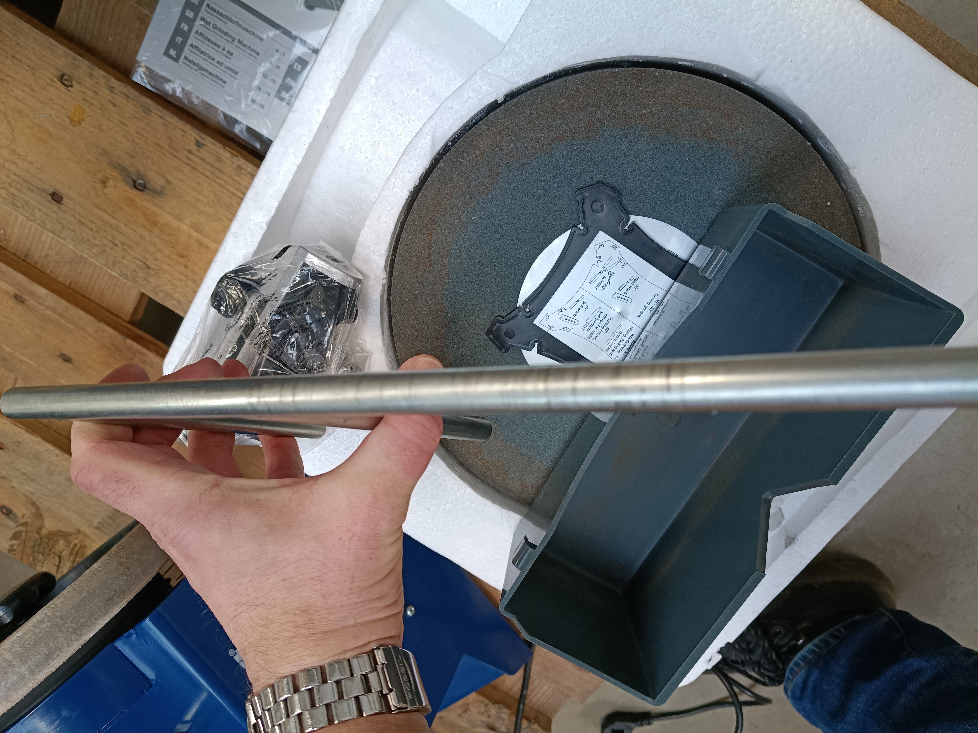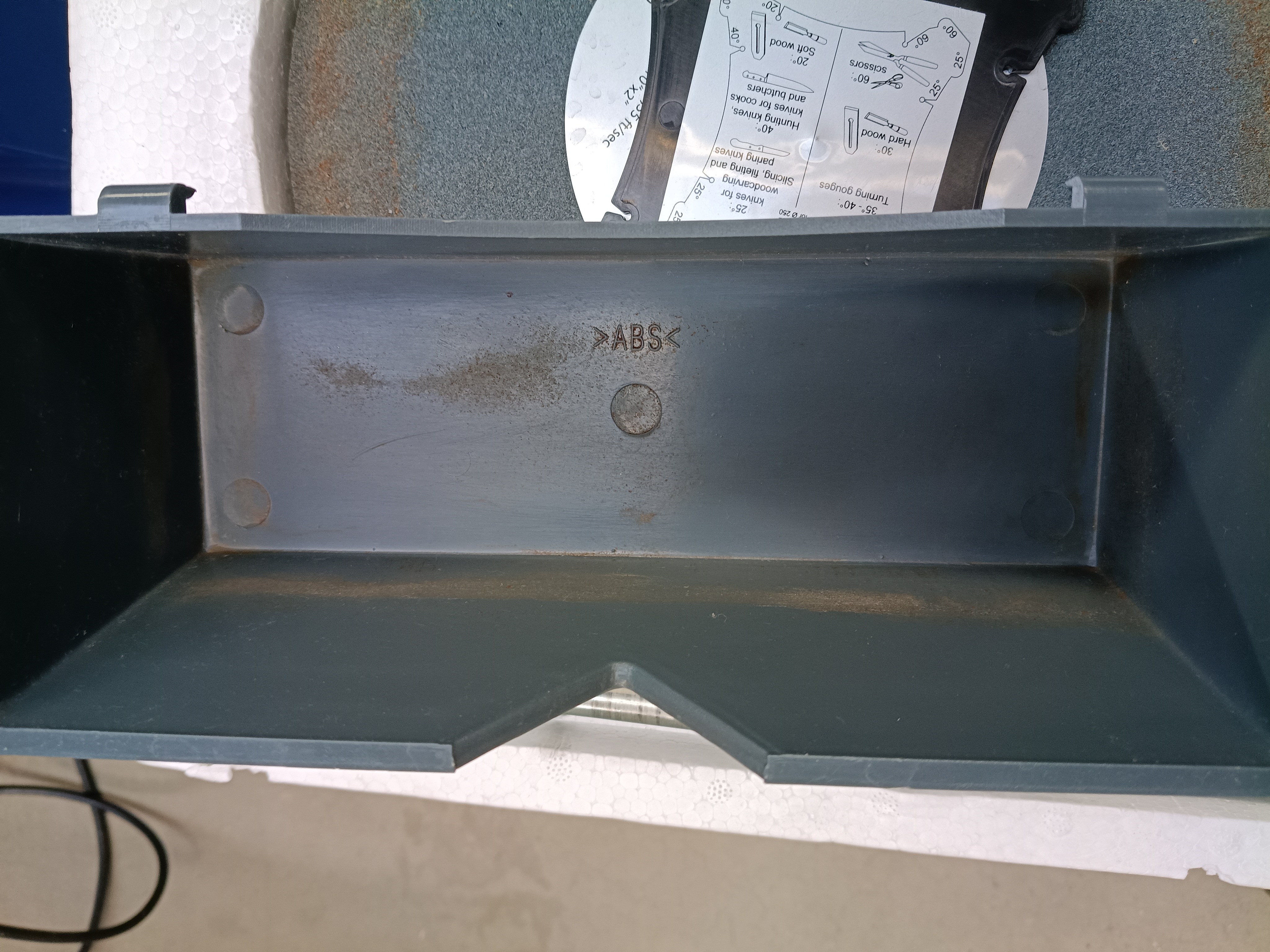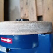 Maszyna używana, widoczne ślady pracy na kamieniu, na kółku z filcem i w pojemniku na wodę.